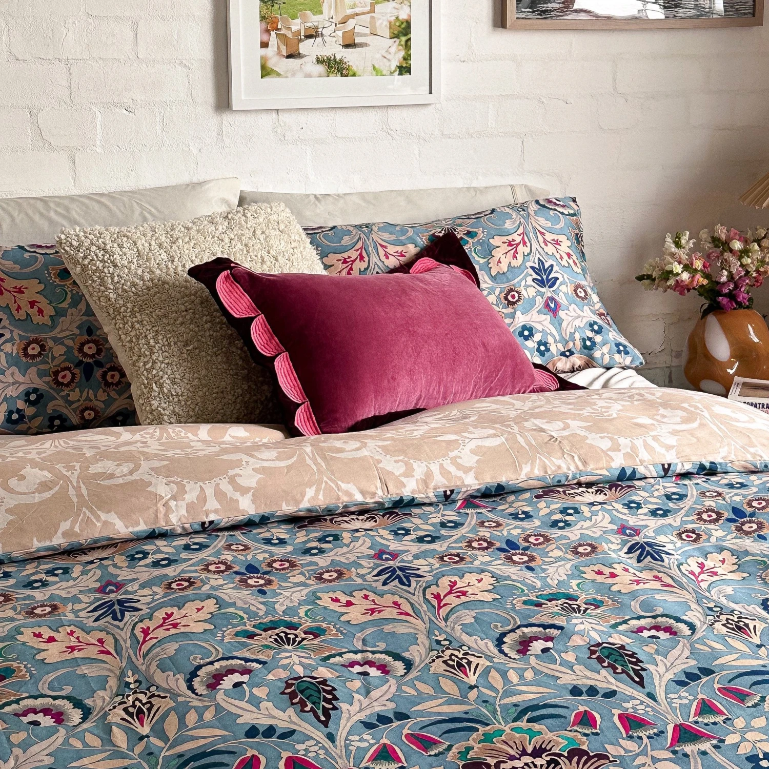 Create a contemporary bohemian vibe with Alina quilt cover set. The intricately painted design is scattered with pop colours to give the traditional motives a modern feel while the cotton sateen fabrication adds a sense of luxury. The reverse print in neutral tones completes the look.Â