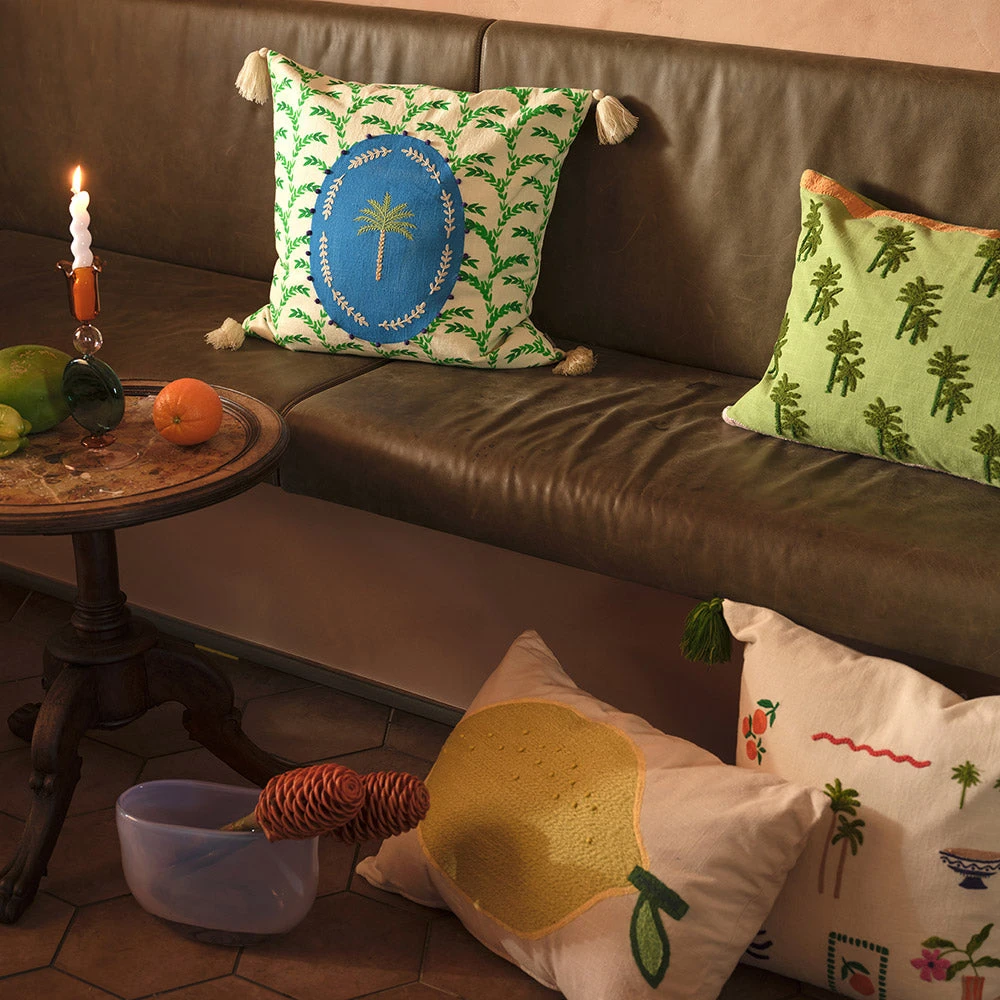 Bring a touch of the tropics into your home with the Bayou Cushion. Featuring delicately embroidered palm trees across a textured cotton slub base, this lush green design adds a fresh and serene vibe to any space. With its intricate detailing and contemporary flair, it’s the perfect accent for a laid-back yet stylish tropical look.