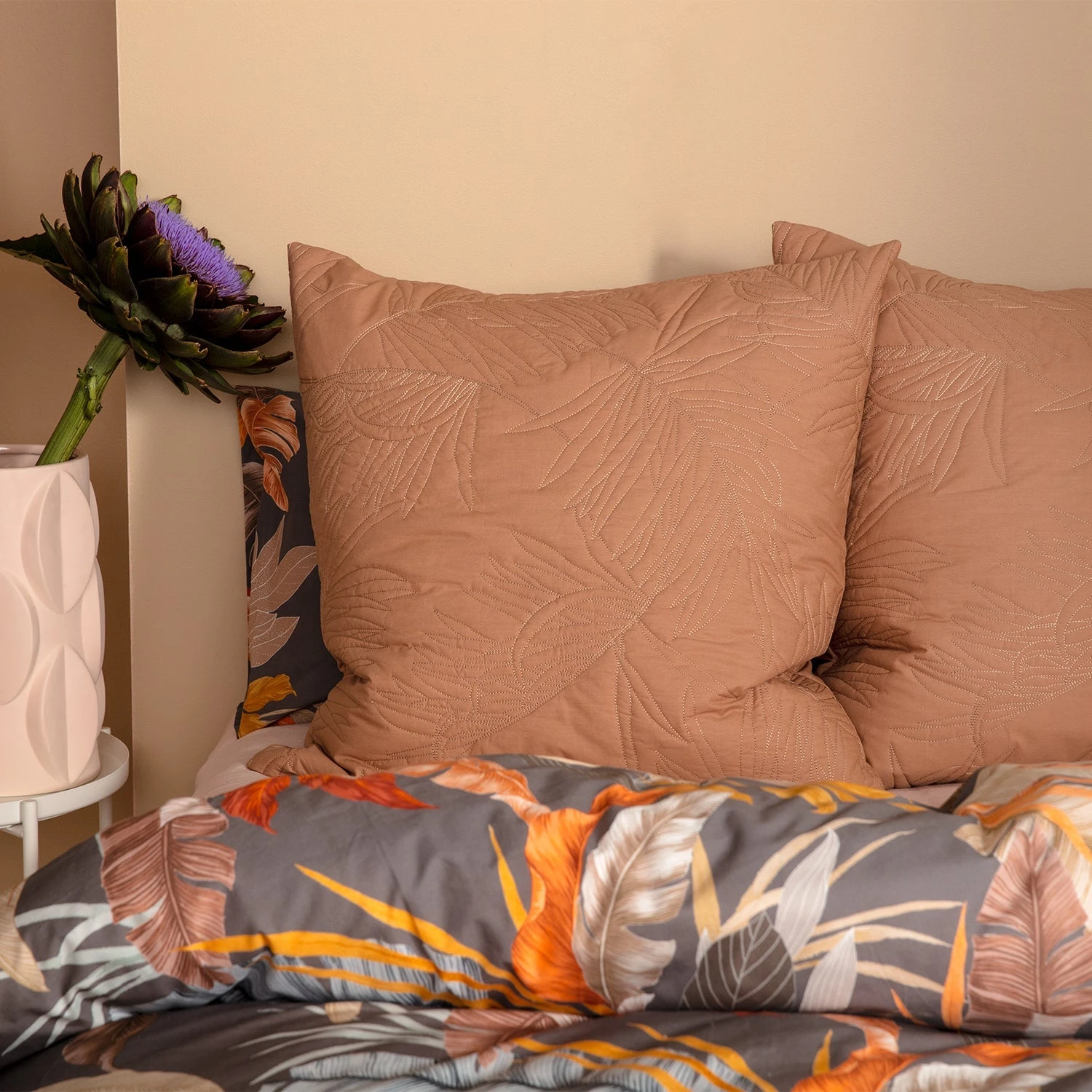 Featuring lush tropical leaves, the Congo European pillowcase is embroidered and quilted on soft cotton percale in earthy tones to deliver a stylish and sophisticated bedroom or lounge essential.