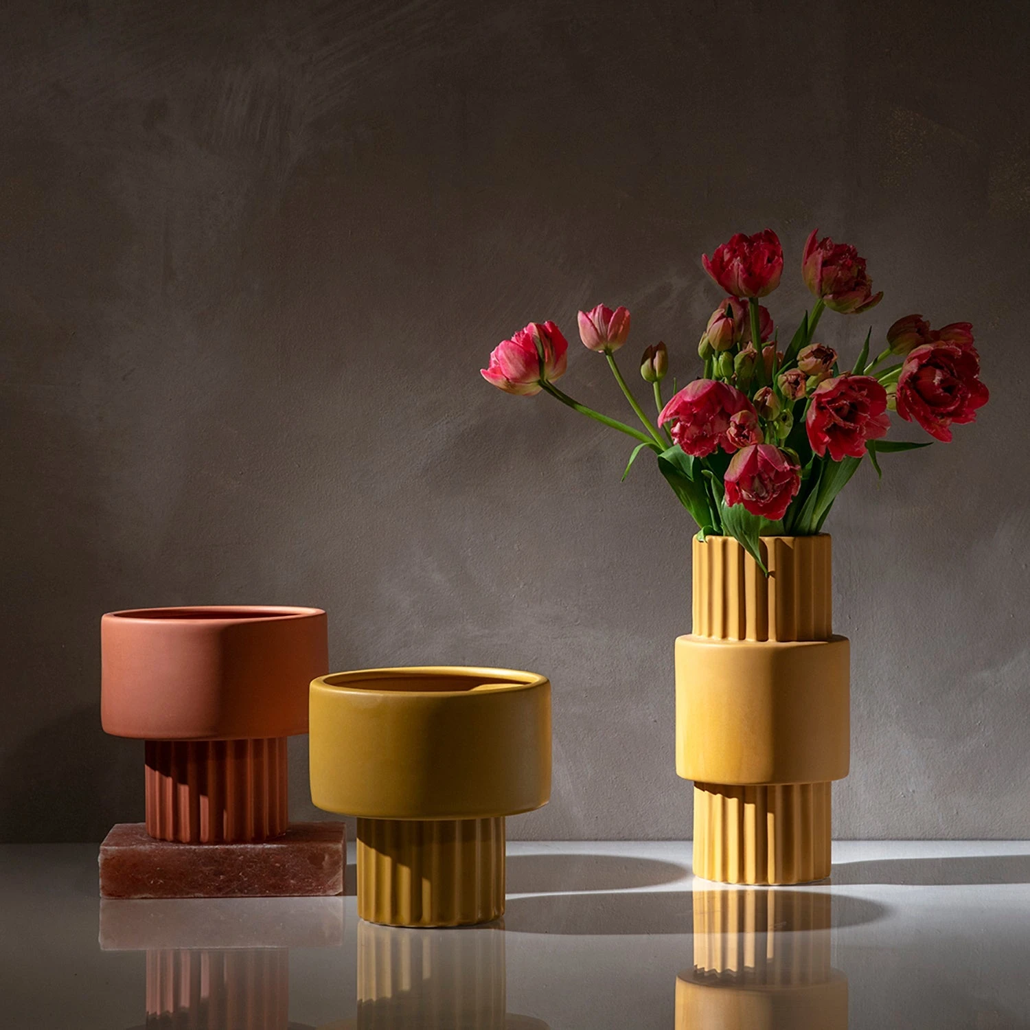 A striking sculptural centrepiece, the Industry vase combines Greek architecture-inspired chiselled accents and organic curves in an earthy tone perfect for adding colour, texture and depth to a neutral interior. Crafted from porcelain using a technique consisting 72 steps executed with perfect precision, the vessel is handmade by artisans exclusively for KAS Australia.