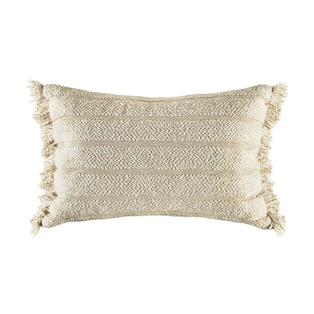 Meet Jess cushion. The epitome of cozy chic for your living space! Crafted with meticulous care, our KAS rectangle cushion combines traditional charm with boho flair, making it a versatile accent piece for any interior. The Jess cushion features a delightful stripe design in a soothing, natural color palette, adding a touch of warmth and elegance to your home decor. Its woven texture and charming tassels evoke a sense of artisanal craftsmanship, while the cotton canvas reverse ensures comfort and durability. Whether you’re lounging on the sofa or sprucing up your favourite reading nook, the Jess cushion invites you to sink into relaxation and style.