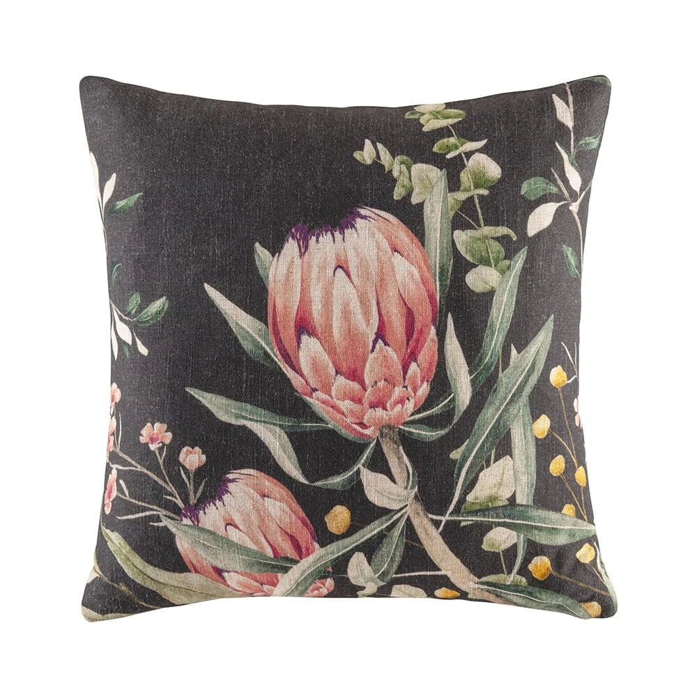 Mysterious yet feminine, the dark florals of the Pippa cushion will rejuvenate your living space. On a textured charcoal linen base, Australian natives flourish in pink and golden hues against a night sky. Style yours in any space in need of contrast to add dimension and depth.