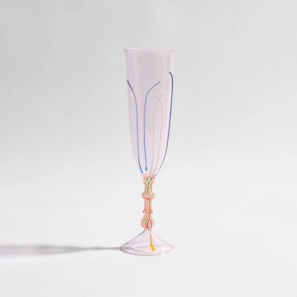 Step into the world of timeless glamour, where the chicest individuals gather for an evening of cocktails and champagne. Our latest collection captures the essence of this sophisticated scene with intricate borosilicate glass, expertly fired and adorned with fine strands of colour. Each baroque-styled coupe and tall-stemmed champagne glass, crafted in the finest soft pink glass, exudes a delicate allure, making every sip a moment of pure elegance.