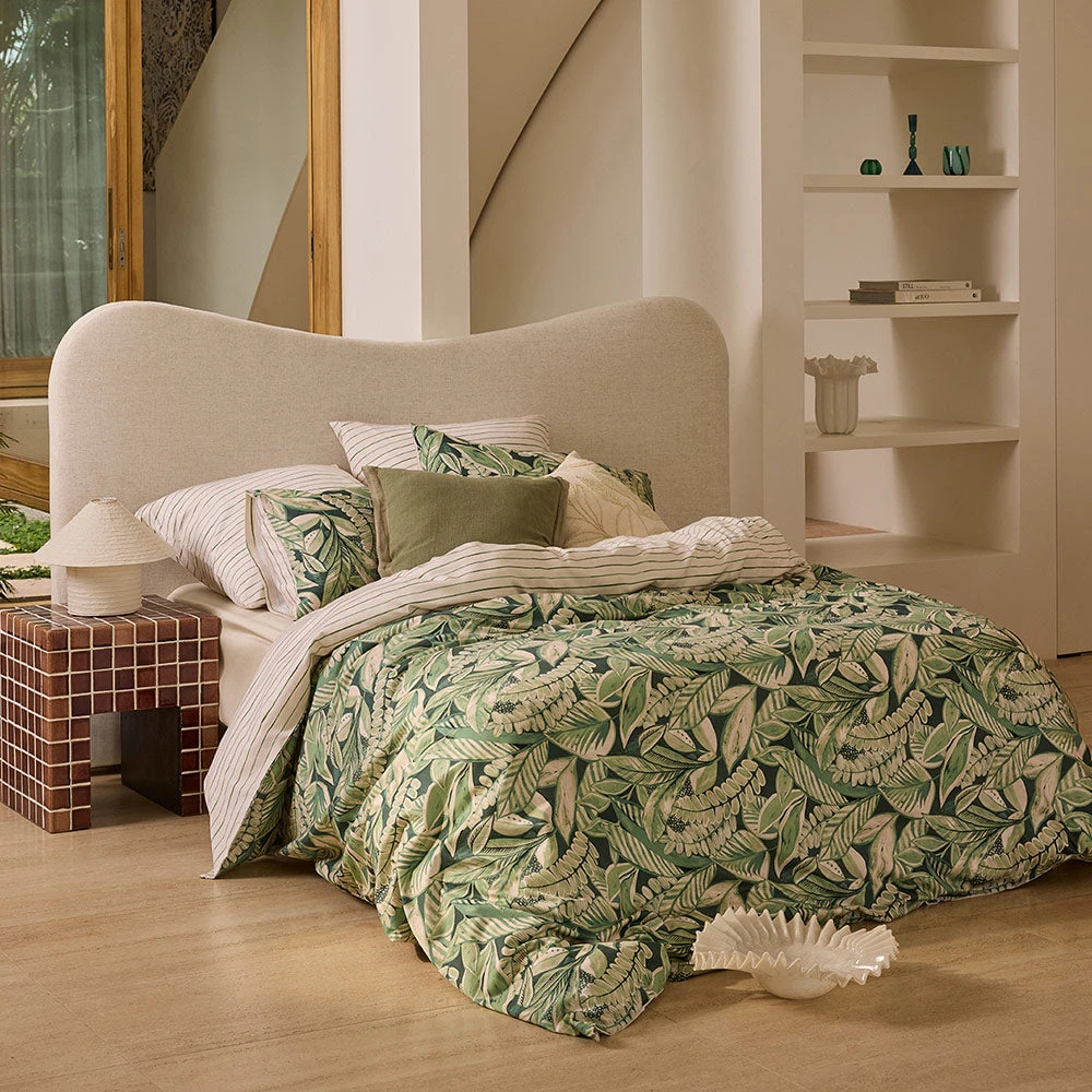 Transform your bedroom into a natural sanctuary with Salvador quilt cover set. The luscious leaf print in nature’s palette is printed on soft cotton sateen and finished with a simple painted stripe reverse to create a feeling of contemporary elegance.Â