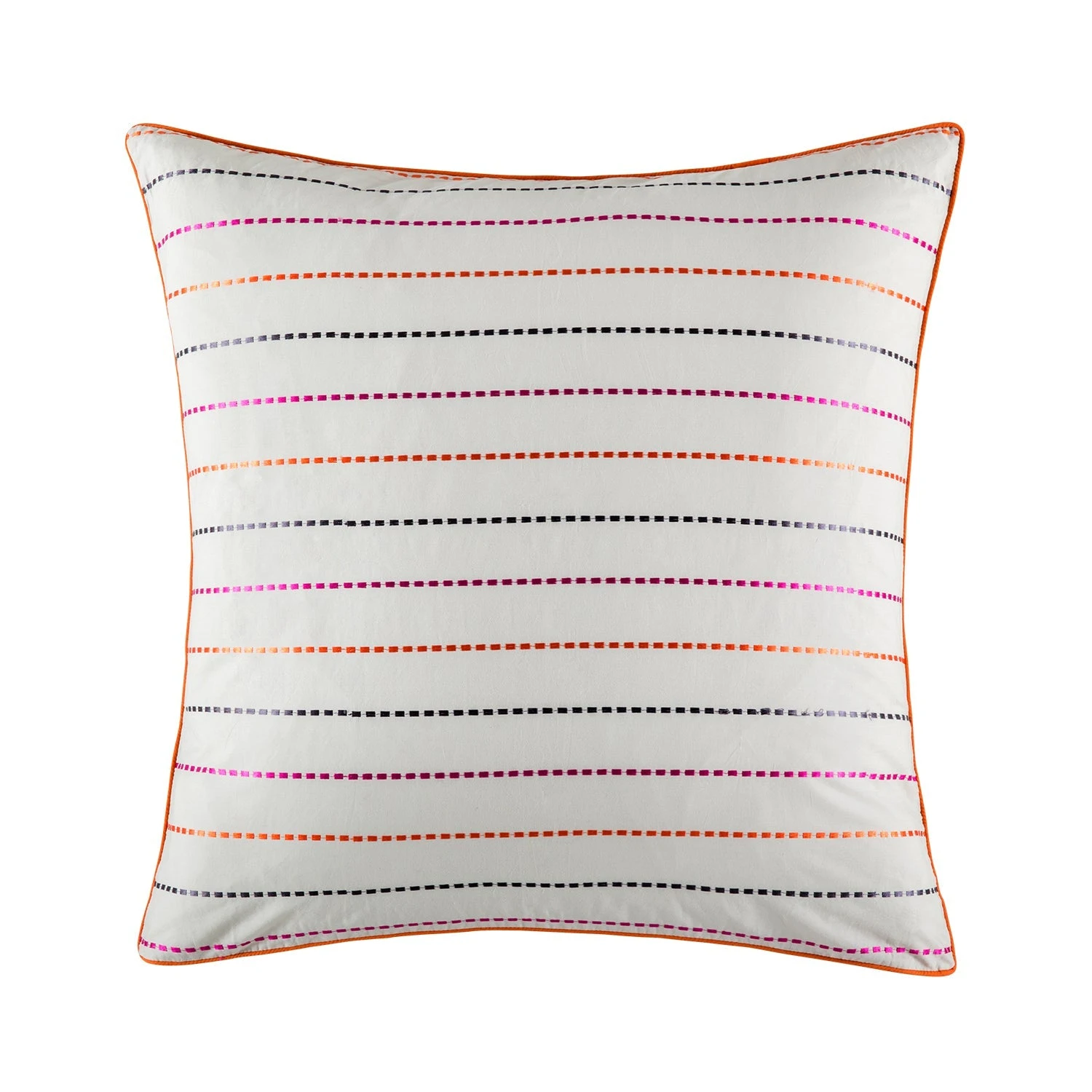 The Tarli quilt cover is inspired by the traditional handicrafts of the Aztecs. Vibrant patterned embroidery contrasts beautifully against a subtle inky denim print. Finished with hot orange piping, Tarli is a statement piece for any bedroom.